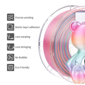 El Filamento 3D Rainbow se destaca por su resistencia y flexibilidad, permitiendo una impresión fluida a una velocidad recomendada de 60-70mm/s. Su acabado brillante y los cambios cromáticos lo convierten en la opción ideal para diseñadores, artistas y entusiastas de la impresión 3D que buscan resultados llamativos y duraderos.