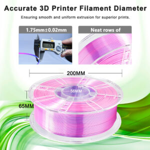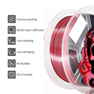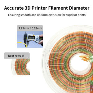 Fabricado con filamento de doble y triple color, este material ofrece una excelente adhesión a la base, minimizando deformaciones y garantizando una impresión estable. Con un diámetro preciso de 1.75mm, es compatible con la mayoría de las impresoras 3D. Su temperatura de extrusión recomendada está entre 195°C y 220°C, lo que lo hace fácil de manejar incluso para principiantes.