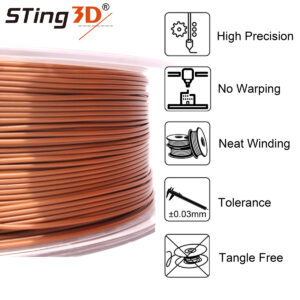 Filamento PLA monocromático color cobre de 1.75mm de alta calidad para impresoras 3D FDM. Material biodegradable, fácil de usar y con excelente adhesión de capas.